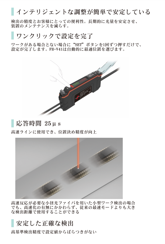 产品简介:智能调整,简单稳定,只需一键即可完成设置。三种检测模式,高速模式25μs可检测高速移动的小型工件。