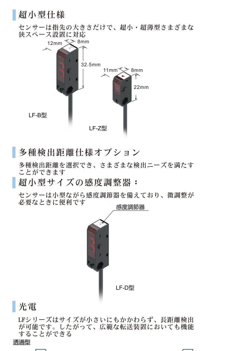 产品简介:超小型规格,多种检测距离可选,在超小型尺寸中的灵敏度调节器,长距离检测