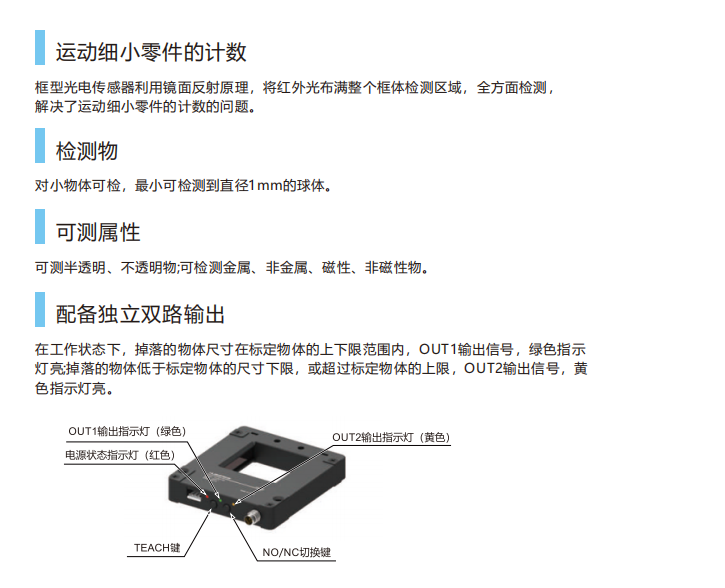 产品简介:框型光电传感器利用镜面反射原理,将红外光布满整个框体检测区域,全方面检测,解决了运动细小零件的计数的问题。