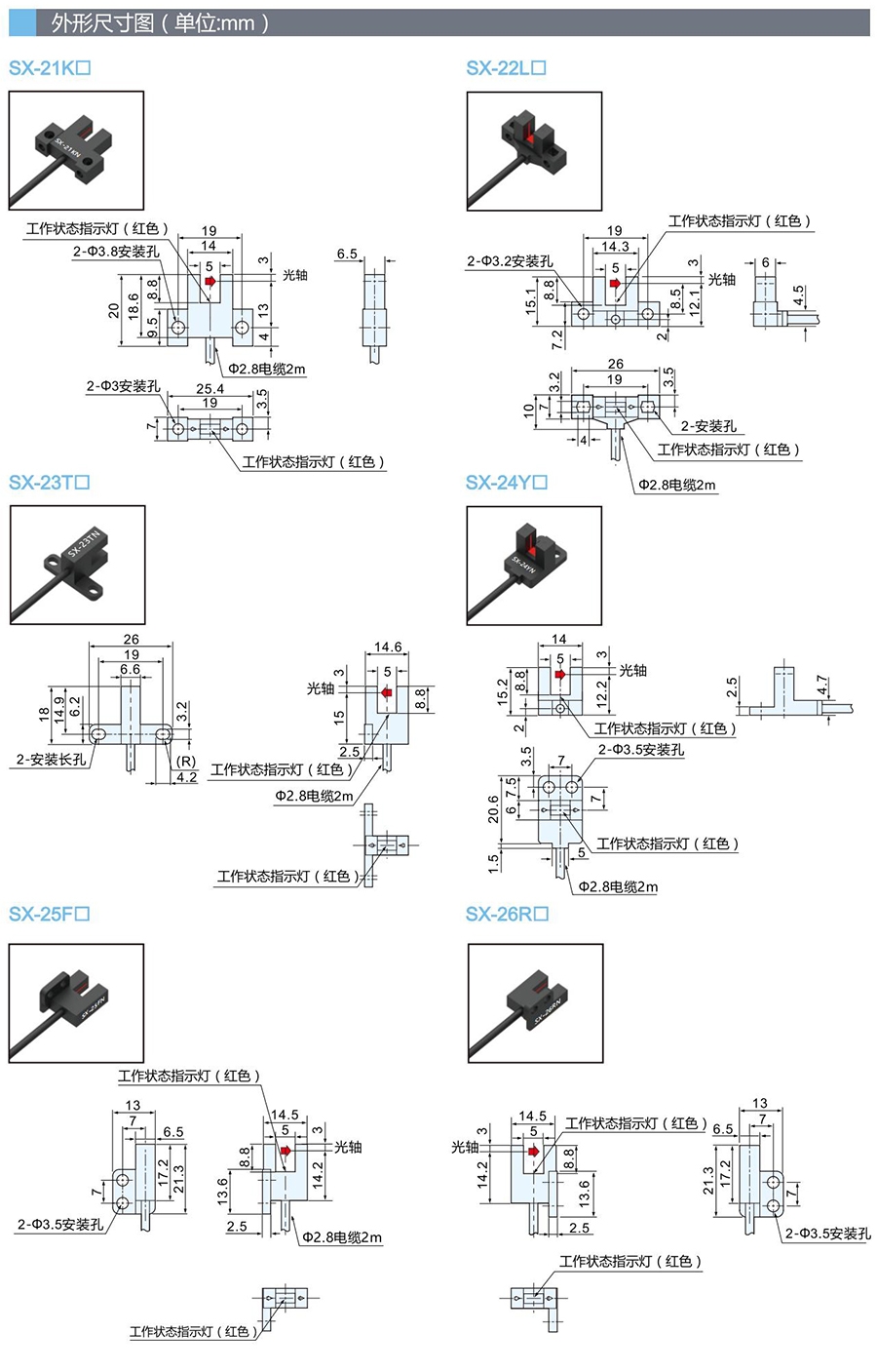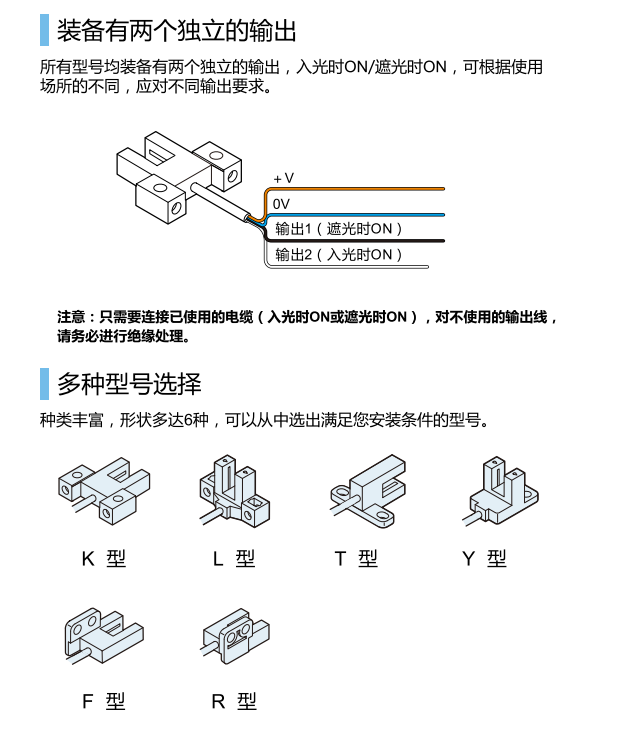 产品简介:装备有两个独立的输出,所有型号均装备有两个独立的输出,入光时ON/遮光时ON,可根据使用场所的不同,应对不同输出要求。