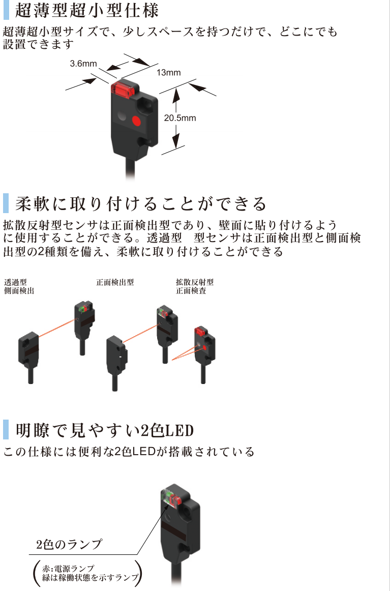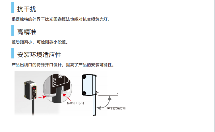 产品简介:可以几乎同等的距离检测黑色和白色工件。即使在异色工件流通的生产线上进行换产时,也无需调节检测距离。