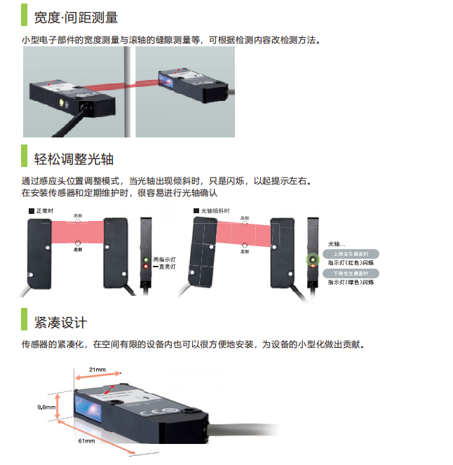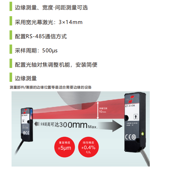 产品简介:边缘测量、宽度·间距测量可选,采用宽光幕激光:3×14mm