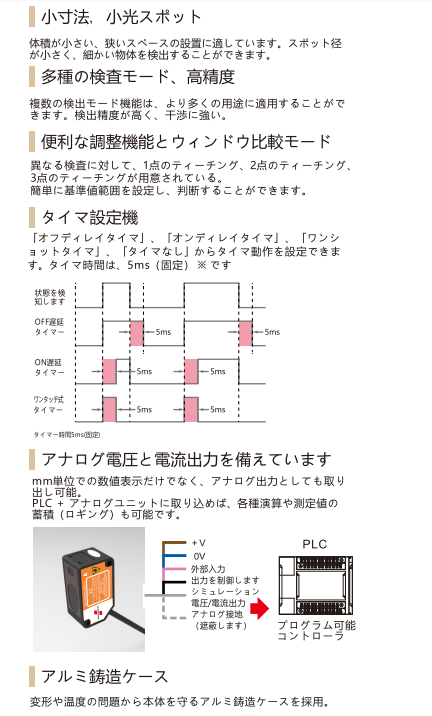 产品简介:体积小,适合狭小空间安装。光点小,可以检测细小物体。多种检测模式功能可适用更多应用场合。检测精度高,抗干扰