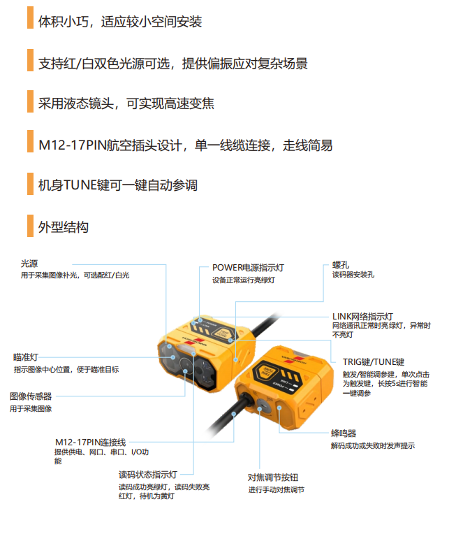 产品简介:体积小巧,适应较小空间安装,支持红/白双色光源可选,提供偏振应对复杂场景