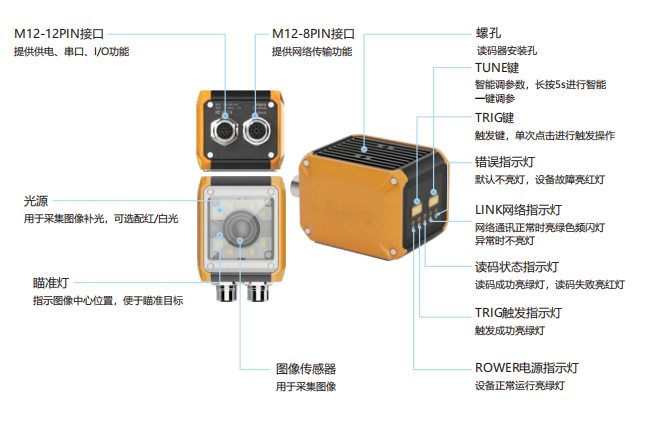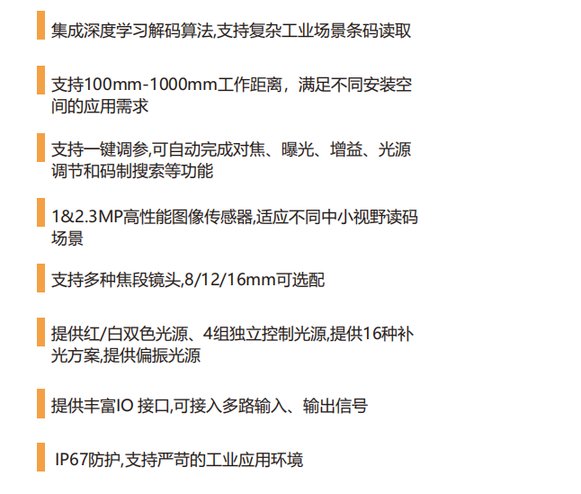 产品简介:集成深度学习解码算法,支持复杂工业场景条码读取,支持100mm-1000mm工作距离,满足不同安装空间的应用需求