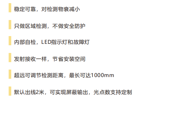 产品简介:稳定可靠,对检测物衰减小,只做区域检测,不做安全防护