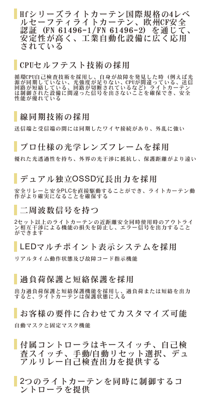 产品简介:HC系列光栅符合国际标准的四级安全光栅,通过欧洲CE安全认证(EN61496-1/EN61496-2),能够为客户提供一个安全的工作场所